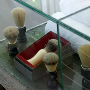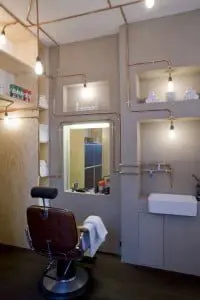 Cruciaal voor succes is evenwel de juiste uitstraling. ‘Ik wilde iets neerzetten dat mannen met high standards aanspreekt’, zegt Van Roon. ‘En dan niet thematisch met nostalgische prullaria als bolhoedjes en wandelstokken. Het ontwerp mocht niet pretenderen dat we er al vijftig jaar zitten. De salon moest de sfeer van de jaren twintig hebben met een verwijzing naar ambachtelijk scheren, maar dan uitgevoerd in eigentijdse materialen.’ Om die ambitie vorm te geven, zocht ze architect Ard Hoksbergen, die ze nog van vroeger kende, op via facebook. Aan hem de taak om tegen een zeer beperkt budget toch de juiste uitstraling te creëren.