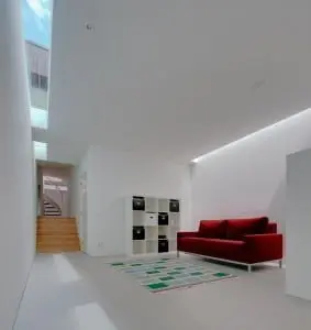 De optie om ondergronds uit te breiden kon direct rekenen op enthousiasme van de opdrachtgever die daar zelfs een ‘James Bond-achtige aanpak’ in zag. Het aanvankelijke plan om een ietwat opstaand glazen dak boven de nieuwe kelder te maken, stuitte op bezwaren van de welstandscommissie. In plaats daarvan zijn er nu een aantal lichtstraten gemaakt. Zo geplaatst dat ze bij een eventuele latere compartimentering van het ondergrondse deel (in totaal 90 vierkante meter), ook afzonderlijke ruimtes van prachtig strijklicht zullen voorzien. De nieuwe uitbreiding bevindt zich onder de ‒ niet gefundeerde ‒ patio. Het was de kunst om de noodzakelijke damwanden zo ver mogelijk naar buiten te plaatsen, tussen de bestaande fundering, zonder dat de bestaande bebouwing zou verzakken. Daarom werd ervoor gekozen om de dunst mogelijke damwanden voorzichtig en langzaam in te trillen.