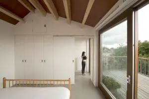 De bovenwoning had een woonlaag en een zolderverdieping met een badkamer en drie slaapkamers, waarvan één inpandig. Het gezin vond de woning niet ruim genoeg en het balkon te smal. Door de helft van het zadeldak te verwijderen is er ruimte gecreëerd voor een extra verdieping op het achterste deel van de woning. De opbouw is gemaakt in houtskeletbouw en heeft een gevelafwerking van stroken lichtgrijze cementvezelplaat. Het lessenaarsdak is duurzaam bedekt met mos-sedum, dat een buffer voor regenwater vormt en in de zomer voor verkoeling van de binnenruimte zorgt. De dakbalken zijn in het zicht gelaten, waardoor het romantische karakter van een zolder behouden is. Op de extra verdieping is met deze opbouw een slaapkamer, hal met wasbak en een ruim dakterras gerealiseerd.