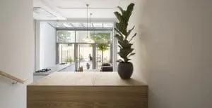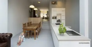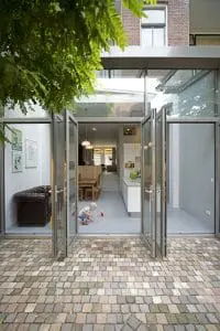 Door de extra hoogte en het glazen dak van de serre is de ruimte nu statig en licht. De smalle keuken heeft plaats gemaakt voor een ruim kookeiland in de eetkamer. De tuin grenst aan de eetkamer met keuken en is bereikbaar via openslaande deuren. In het midden van de begane grond is het hoogteverschil gebruikt om in de verdiepte kruipruimte een bijkeuken te realiseren. De trap naar de bijkeuken is geïntegreerd in een kast die het verlaagde deel van de woonkamer begrenst. Door het verlagen van de vloer, de uitbouw, de open keuken en de inbouwkast is de ruimte geen pijpenla meer.