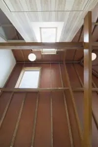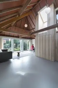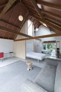 Het plafond is verwijderd en de oorspronkelijke sporenkap van ongeschaafd Amerikaans grenen is zichtbaar geworden. Het hout van het plafond is weer gebruikt om de kapcontructie aan te passen. De buitenmuren zijn voorzien van geïsoleerde voorzetwanden en de cementvloer is zwevend op isolatie aangebracht en afgewerkt met een kunststof gietvloer. Het logeerverblijf heeft een optimale lichtinval doordat er elektrisch bedienbare dakramen zijn aangebracht.