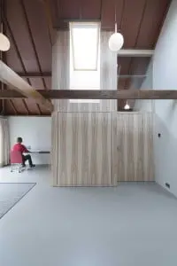 De sfeer in het logeerverblijf wordt bepaald door het contrast tussen enerzijds de authentieke houten kapconstructie met de ambachtelijke details en aan de andere kant de minimalistische inrichting en afwerking. In de ruimte is één binnenwand geplaatst met een kast, uitklapbed en daklicht. Deze wand, afgewerkt met essenolijf fineer met een levendige houttekening, is tegelijkertijd de begrenzing van de badkamer. De wastafelkast is maatwerk en brengt eenheid in de materiaalkeuze aan door toepassing van het zelfde fineer als de binnenwand.