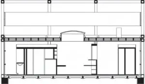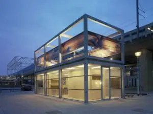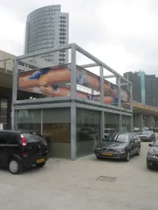 Het kantoor heeft twee functies: de verkoop van parkeerkaarten en toezicht op het terrein. Het is opgebouwd uit twee stalen frames van drie meter hoog. De beheerdersruimte, betaalbalie, sanitair en opslagvoorzieningen zijn ondergebracht in het onderste frame. Deze elementen zijn neergezet als losse objecten en uitgevoerd in vurenhout, evenals de vloer. De gevel is volledig uitgevoerd in glas en staat los van de andere onderdelen van het gebouw.