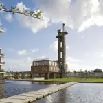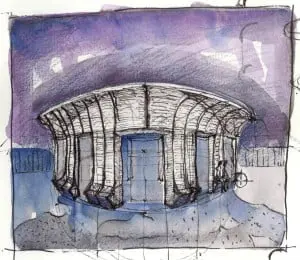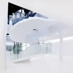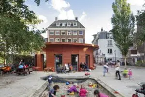 Paviljoen de Waag in Amsterdam is een ontwerp van Architectenbureau Marlies Rohmer. De ovale, sculpturale vorm benadrukt het vrijliggende karakter. De gevel bestaat uit glazen puien en penanten die in de vorm van een bankje op de grond ‘landen’.