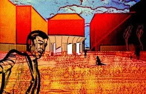 Het paviljoen staat in speeltuin de Waag en is gemaakt van roestbruin gecoat aluminium en sluit daarmee aan bij de baksteen bebouwing gelegen aan het openbare binnenterrein. Door de sculpturale vorm wordt het verzelfstandigd en neemt daarmee een autonome positie in tussen de speeltoestellen. Het grasdak is de groene ‘vijfde gevel’ van het paviljoen.