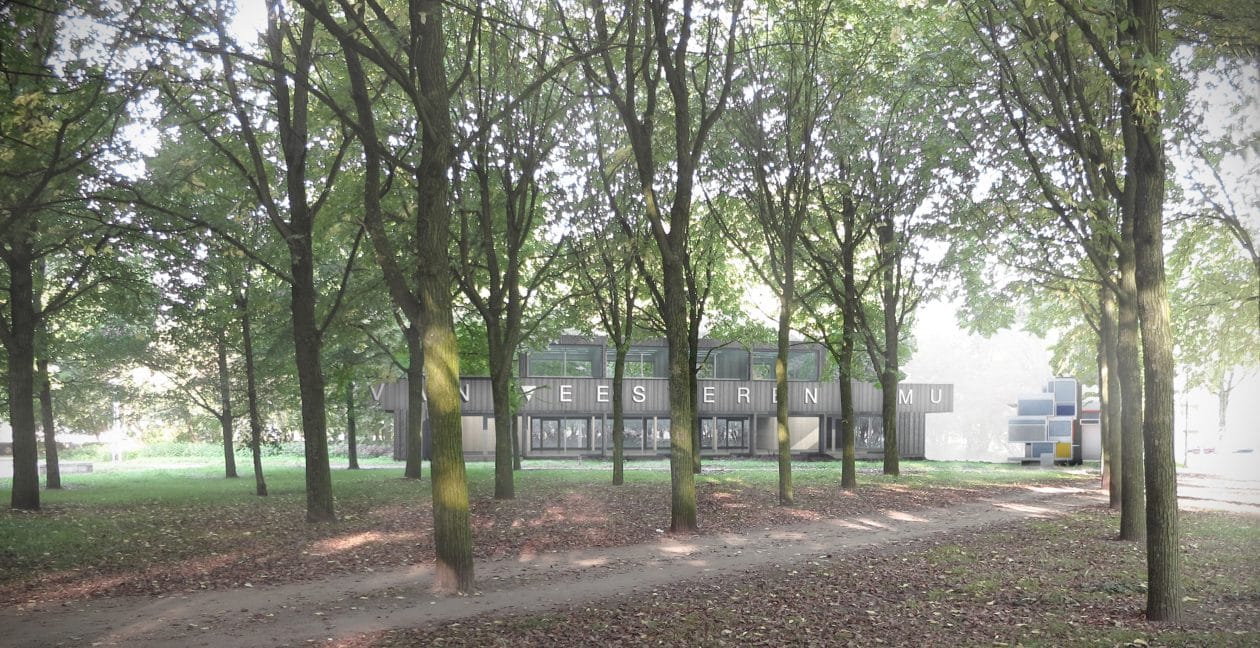 De geometrische, zuiver architectonische aanleg van de noordoever van de Sloterplas is in de loop van de tijd veranderd in een groen park. Het café de Oostoever heeft een lichte modernistische architectuur. In contrast daarmee is het ontwerp van het nieuwe museumpaviljoen afgestemd op het natuurlijke karakter dat de plek nu heeft. De vormentaal evenwel is schatplichtig aan het modernisme van de tijd waarin de Sloterplas is ontstaan. De combinatie van moderne eenvoud, duidelijke lijnen, veel licht, heldere, grafische kleuren en natuurlijke materialen past zowel bij de oorspronkelijke opzet en het gedachtegoed van Van Eesteren als bij de huidige tijd, en verzoent de liefde voor de natuur en het modernisme.
