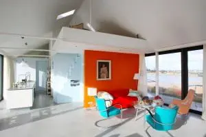 ‘Vroeger stond hiernaast een molen, en om een windmolen te mogen exploiteren, moest een molenaar het zogenaamde windrecht krijgen. In ons huis speelt wind ook een belangrijke rol. We maken gebruik van louter natuurlijke ventilatie en voor de trek is de wind van belang. Daarom staat de kop van het huis, die we open kunnen zetten, op de wind.’ Post vult aan ‘Ik ben opgegroeid in Scheveningen, op een plek met weidse uitzichten, waar de seizoenende aannemer. Ook maken ze zelf onderdelen: bijvoorbeeld het keukenblok, de ganzentrap (8) en het vogelhuis (5), en ze hebben een weekend ‘geclickbrickt’ met de familie. Uiteindelijk, na drie jaar wonen in het krotje, is eind 2012 het nieuwe huis zo ver af dat ze kunnen inhuizen. Nu, twee winters en zomers verder, zijn ze helemaal gesetteld en is de inrichting op enkele kleinigheden af.
