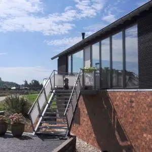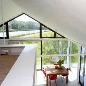 Hoe bevalt het? ‘Het huis past als een handschoen’ verzekert Petra Reijnhoudt, de vrouw van Jouke Post en trotse bewoonster van Recht op Wind, zoals ze het huis gedoopt hebben. ‘Vroeger stond hiernaast een molen, en om een windmolen te mogen exploiteren, moest een molenaar het zogenaamde windrecht krijgen. In ons huis speelt wind ook een belangrijke rol. We maken gebruik van louter natuurlijke ventilatie en voor de trek is de wind van belang. Daarom staat de kop van het huis, die we open kunnen zetten, op de wind.’ Post vult aan ‘Ik ben opgegroeid in Scheveningen, op een plek met weidse uitzichten, waar de seizoenen en het weer veel meer ervaarbaar waren dan in de huizen waar ik later woonde. Dit huis heb ik zo ontworpen dat je het buitenklimaat op een aangename en intensieve manier kunt ervaren. We horen de regen op het zinken dak, voelen de wind, wanneer we de ramen openen – en dat is zo vaak mogelijk – en zien de zon en de wolken aan alle kanten om ons heen.’ En af en toe vaart er een boot voorbij.