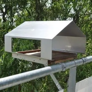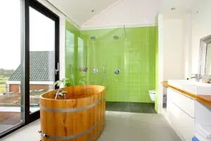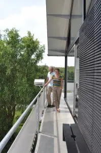 de dijk loopt een luie trap naar de entree (6). De verdieping van het huis ligt boven dijkniveau, waardoor de woonkamer, keuken, badkamer en slaapkamer van een prachtig uitzicht genieten op de omgeving. Koele lucht wordt vanonder het huis door natuurlijke trek naar binnen gezogen, warme lucht kan via vensters of een gek weer naar buiten. De hoge vensters zijn elektrisch bedienbaar, en sluiten automatisch via een sensor bij regen. Mechanische ventilatie is er niet, en ook geen koeling. ‘Als je koeling hebt, dan moet je de boel dichthouden, en dat is weer slecht voor het binnenklimaat’ verzekert Post, die zichtbaar tevreden is met zijn huis. ‘We wekken via pv-panelen meer energie op dan we verbruiken. Warm water krijgen we via zonnecollectoren.
