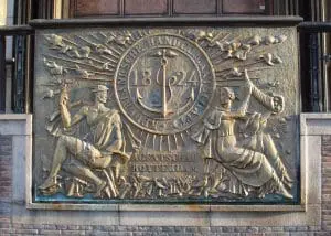Het gebouw staat op een natuurstenen sokkel en bestaat uit een betonskelet. De gevels zijn uit een speciaal formaat steen opgebouwd. De entree is gemarkeerd met een voornaam portaal, van kunstenares Nel Klaassen (1906-1989), waarin het embleem van de NHM is verwerkt. De ramen op de parterre zijn voor zien van een smeedijzeren hekwerk, hetgeen een gevoel van veiligheid moet uitstralen. Nel Klaassen zei over een eerdere vernieuwing van het gebouw: