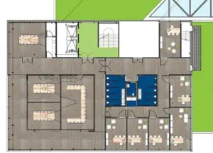 Alle drie de bouwdelen hebben trappen die voor zover mogelijk in elkaars verlengde liggen, waar door lange zichtlijnen ontstaan. De trappen liggen in het kerngebied van de bouwdelen, met links en rechts hiervan gangen waaraan lokalen en kantoren grenzen. Verder zijn in de kerngebieden voorzieningen als toiletten, pantry’s, kopieerruimten en alle installaties te vinden, waardoor deze niet in lelijke dozen op het dak hoeven te staan.
