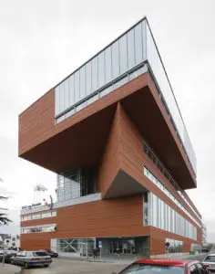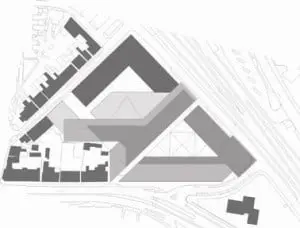 De architect noemt het een groundscraper, een groot gebouw dat zich moeiteloos in zijn omgeving past. Lager waar het moet aansluiten op bestaande bebouwing, hoger waar plannen op hoogbouw wijzen. Het is een expressief gebouw, niet in de laatste plaats door opvallende overstekken en de felgekleurde bakstenen gevel. In het interieur is het kleurrijke kunstwerk op de vloer van het grote volledig kolomvrije atrium een blikvanger.