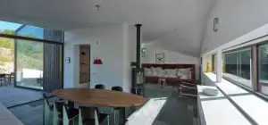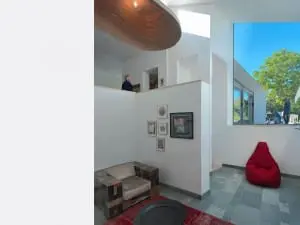 De woonruimte bestaat uit één grote lichte open ruimte die is opgedeeld in verschillende leefplekken, verbonden met elkaar door de schuine dakvlakken. De niveauverschillen zorgen voor privacy en een menselijke maat, de gezinsleden kunnen zonder elkaar te storen de woning ieder op hun eigen manier gebruiken.