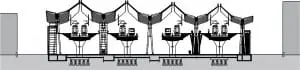 Ook evenwijdig aan de sporen zijn er tussen de randen van de perronoverkappingen lichtopeningen vrijgelaten. Deze met ‘hanenkammen’ van stalen roosters afgebiesde dakspleten dienen echter vooral om windhinder op de perrons te voorkomen. De stalen roosters functioneren hierbij niet zozeer als windscherm maar als druiprek tegen schuin invallende regen. Aan de onderzijde zijn de overkappingen afgewerkt met geluiddempend materiaal en ongeschilderd hout (brandwerend geïmpregneerd Oregon Pine) om de hightech staalconstructies een warme, gedistingeerde uitstraling te geven. Constructief staan de stalen overkappingen volledig los van de betonnen viaducten om te vermijden dat de windkrachten op de bovenbouw en de krachten van optrekkende en remmende treinen op de onderbouw elkaar onder bepaalde omstandigheden zouden versterken.