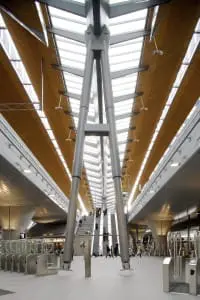 Ook evenwijdig aan de sporen zijn er tussen de randen van de perronoverkappingen lichtopeningen vrijgelaten. Deze met ‘hanenkammen’ van stalen roosters afgebiesde dakspleten dienen echter vooral om windhinder op de perrons te voorkomen. De stalen roosters functioneren hierbij niet zozeer als windscherm maar als druiprek tegen schuin invallende regen. Aan de onderzijde zijn de overkappingen afgewerkt met geluiddempend materiaal en ongeschilderd hout (brandwerend geïmpregneerd Oregon Pine) om de hightech staalconstructies een warme, gedistingeerde uitstraling te geven. Constructief staan de stalen overkappingen volledig los van de betonnen viaducten om te vermijden dat de windkrachten op de bovenbouw en de krachten van optrekkende en remmende treinen op de onderbouw elkaar onder bepaalde omstandigheden zouden versterken.