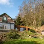 Daarnaast was licht het belangrijkste punt in het programma van eisen. Hoewel de ruimtes in het bestaande huis redelijke vensters hebben, treedt er niet zo veel daglicht toe door de vele bomen rond het huis. Via de uitbreiding met veel glas komt er nu ook in de bestaande kamer op de begane grond meer daglicht.