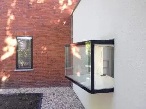 De gevels van de uitbreiding zijn strak gedetailleerd en wit gestuct. Het schuin uit de noordgevel stekende venster biedt zicht op het lommerrijke Zuiderpark, aan de overkant van de Parklaan.