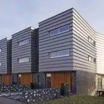 De volumes en schijven zijn afwisselend uit twee contrasterende kleuren baksteen opgebouwd. Het hoogste deel van het huis is voorzien van een houten schijf omkaderd met een verzinkt stalen U–profiel. Deze overstekende dakrand dient als zonwering voor de rondgaande glasstrook eronder. De combinatie van thermisch verzinkt staal en vergrijzend red cedar is ook terug te vinden bij de ingangsluifel, de garagedeur, het carportdak en de vaste lamellen zonwering. De hardhouten accentkozijnen zijn uitgebouwd en transparant afgewerkt.