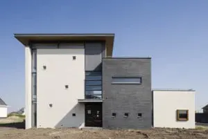 De volumes en schijven zijn afwisselend uit twee contrasterende kleuren baksteen opgebouwd. Het hoogste deel van het huis is voorzien van een houten schijf omkaderd met een verzinkt stalen U–profiel. Deze overstekende dakrand dient als zonwering voor de rondgaande glasstrook eronder. De combinatie van thermisch verzinkt staal en vergrijzend red cedar is ook terug te vinden bij de ingangsluifel, de garagedeur, het carportdak en de vaste lamellen zonwering. De hardhouten accentkozijnen zijn uitgebouwd en transparant afgewerkt.