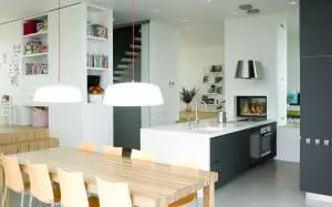 De belangrijkste ruimtelijke verbinding is de woonkeuken met het terras. Zonder dat er een aparte buitenkeuken is ontworpen heb je in de keuken het gevoel buiten te koken. De 3.35m1 hoge begane grond is op de hoek middels een schuifpui opengewerkt naar het terras, de tuin en het water. De kozijnen van de pui zijn weggewerkt in de wanden, vloer en plafond. De stijldikte tussen de vaste en schuivende pui is slechts 2 centimeter.