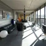 Door de woonkamer op de bovenste verdieping te situeren, heeft Kühne Architecten de leefruimte in de luwte weggewerkt. Hierdoor heeft de woonkamer inpandig het karakter van wonen in hoogbouw gekregen. Per raampartij bevinden zich drie glasvlakken boven elkaar in blauwkleurige aluminium kozijnen. Het middelste is een draai-/kiepraam. Het glas is geluidwerend. De bakstenen gevel met binnenspouwblad, extra afgedichte kieren en het situeren van de ventilatieopeningen aan de achtergevel zijn de overige toepassingen om inpandig een geluidsarm leefklimaat te bewerkstelligen. Geen overbodige luxe, aangezien het gebouw hier aan het drukste gedeelte van de Prins Hendrikkade staat, die op deze locatie de op- en afrit van de drukke Willemsbrug is en die een belangrijke verkeersader tussen noordelijk en zuidelijk Rotterdam vormt.