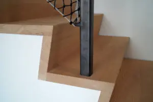 De vide met de monumentale trap vormt het hart van het huis. De bomen, treden en stootborden van de bijna 6 meter hoge trap bestaan uit 38 mm dik oregon pine, dat zijn natuurlijk uitstraling behoudt door een afwerking met matte lak (Skylt). Rond de vide zijn de stalen balustrades ingevuld met netten. ‘Die refereren naar de visserij in Spakenburg, waar ik ben opgegroeid, en in IJmuiden. Ze zijn mooi om te zien, robuust en transparant’. Datzelfde geldt voor het staalwerk, gemaakt door een zelfbouwer iets verderop in de straat. Vanuit de woonkeuken aan de tuin kijk je dwars door de vide naar het daklicht.
