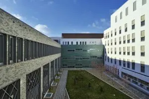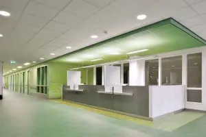 “Belangrijk bij het ontwerpen van een ziekenhuis is dat de patiënt zich op zijn gemak voelt in het gebouw,” zegt Henk de Jong, architect en directeur bij dJGA. In het hotelgebouw ligt het accent op gastvrijheid. De kamers zijn sfeervol ingericht, met grote ramen. Door het gebruik van een vloer met houtstructuur en chique, bruine gordijnen oogt de kamer van de patiënt als een hotelkamer.