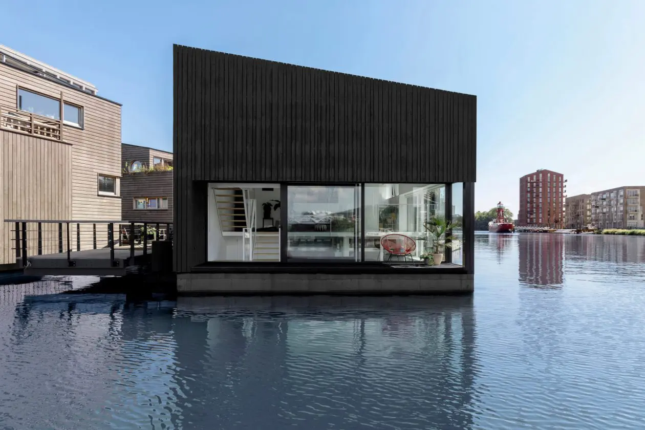 Drijvend huis met schuine openingen en uitgesneden hoeken