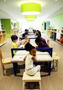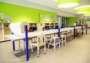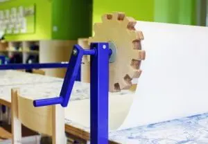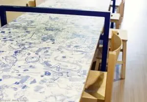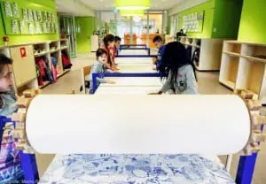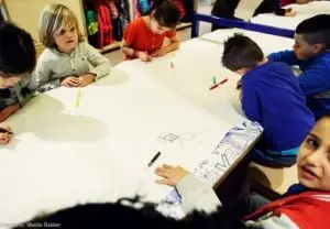 De tafel is gedecoreerd met duizenden kindertekeningen om de fantasie te stimuleren. Willen de kinderen zelf tekenen, dan is er een enorme papierrol waarop ze hun ideeën gezamenlijk kwijt kunnen. “Hoe geweldig zou het zijn om over een paar jaar een hele generatie creatieve, ondernemende kinderen uit te zwaaien?”, aldus meester Johan.